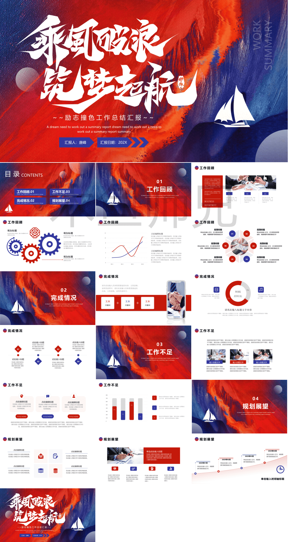 合集:红色乘风破浪工作总结工作计划PPT模板