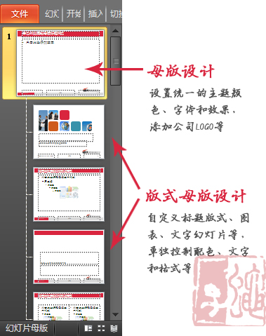 母版设计:可以设置统一的主题颜色、字体和效果,添加公司LOGO等,在母版进行的设置其他版式母版会自动与之呼应。