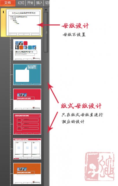 我们可以把版式母版设计也就是内页设计的更丰富些,添加必要的章节和目录页,使章节和目录页的设计也有所区别。在我看来这算是一种捷径的方法,既然在母版设计里设置出所有的内页都雷同,那就不要在母版设计里设置,只在版式母版中设计就好,为了方面可以为每个内页母版命名。