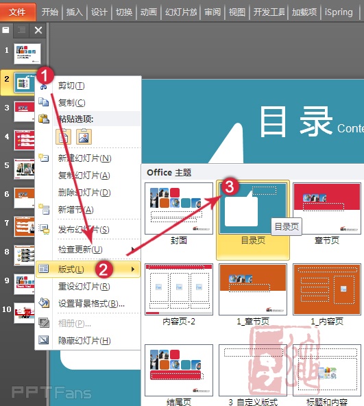 例如PPT第二页是目录页,只要选择相应的内页版式即可,在上面添加相应的文字说明就好。
