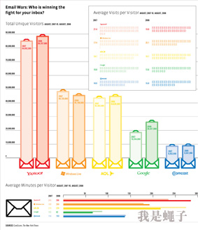 该图表从不同访问者总数、每位用户的访问次数、每分钟的访问者数量三个方面对yahoo、windows live等几大e-mail服务商自2007年8月至2008年8月的业务发展情况进行了考量。