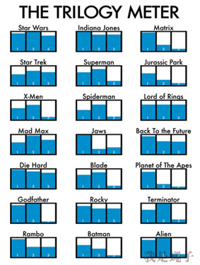 没有一个字, 完全用简单的图形来描述一个电影三部曲分别的热门程度, Dan Meth 信息设计的功底很深, 你对这些电影有同感吗?