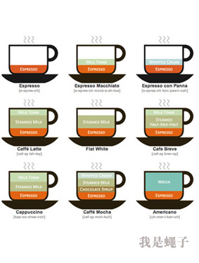 该图为我们展示了各式咖啡的“构成”,大家可以找到很熟悉的拿铁、摩卡、卡普奇诺等,哪一款使您的最爱?