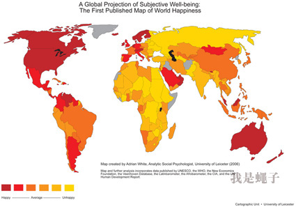 由莱斯特大学的adrian white绘制的全球幸福指数分布图,以世界地图为基准,通过环球邮报的问卷调查制作而成。图表中虽然没有非常实质性的内容,但仍然可以作为我们提供全球各地人们生活状态的参考。