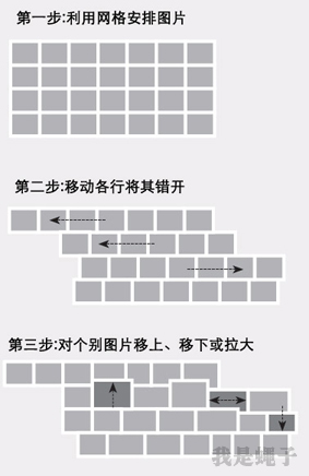 将照片按网格排列放置,照片中的脸部基本都朝向内部。并且尽可能让整个版面的明暗平均分布。放大其中的一两张图片,增加视觉冲击力。