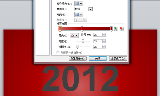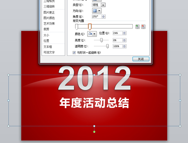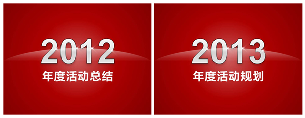参考做法(以2012年度活动总结为例):第一步:设置幻灯片背景为渐变填充