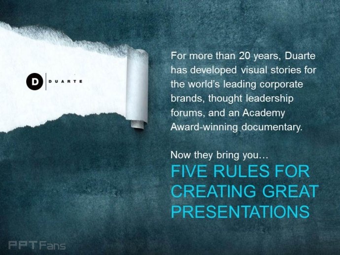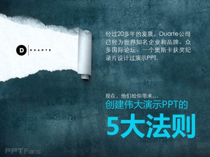 Duarte公司是世界顶级PPT设计机构,为很多大公司和知名人士设计过PPT,在TED这样的国际知名演讲活动中,很多演讲者的PPT都出自Duarte。其中美国副总统戈尔的演讲《难以忽视的真相》即出自Duarte公司。