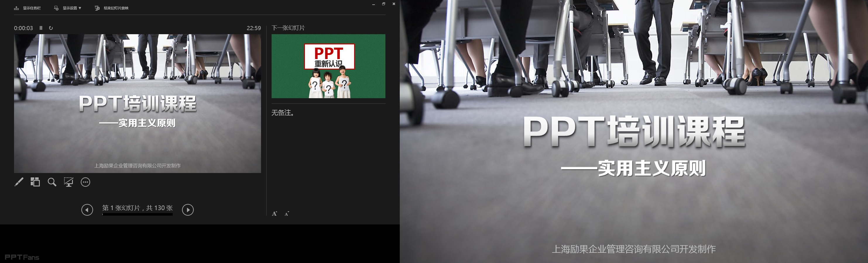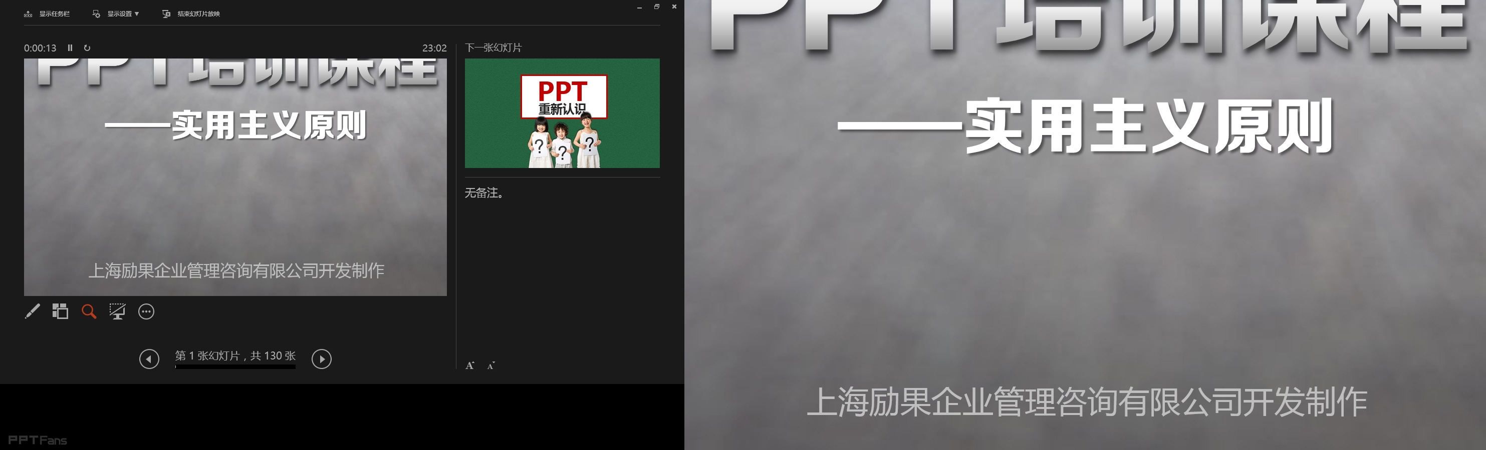 powerpoint2013放映界面主体部分分为3大块,当前放映页、下一张幻灯片预告和备注页(这里是两个屏幕的截图,左边部分为电脑上的屏幕,右边部分为投影仪打在画布上的效果),这样一来可以看到备注,提示这张幻灯片的主要讲解思路,二来还能知道下一张幻灯片要讲什么,此发明,要赞!!!