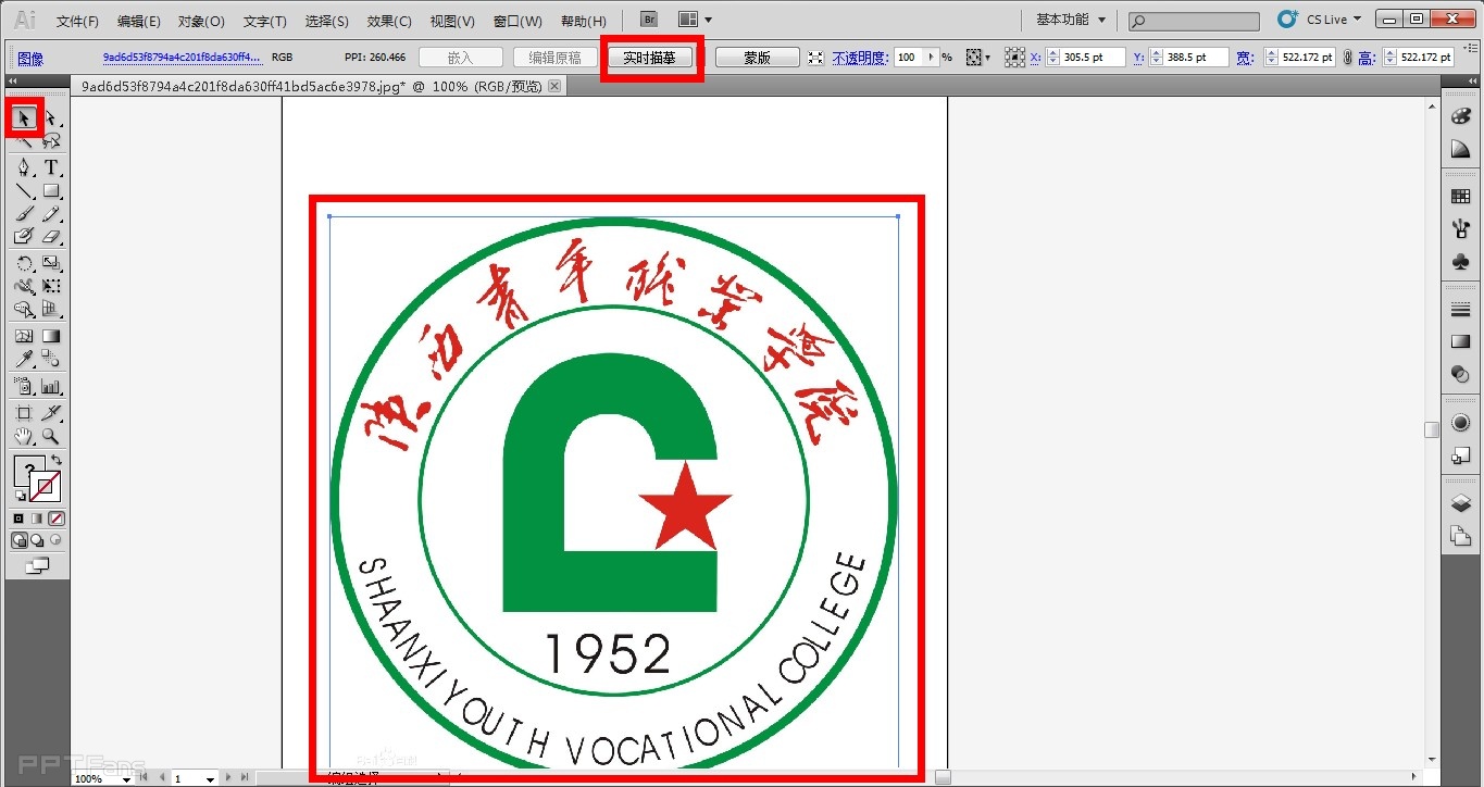 02.用“选择”工具,“点击图片”,菜单栏下方就会出现“实时描幕”,点击之