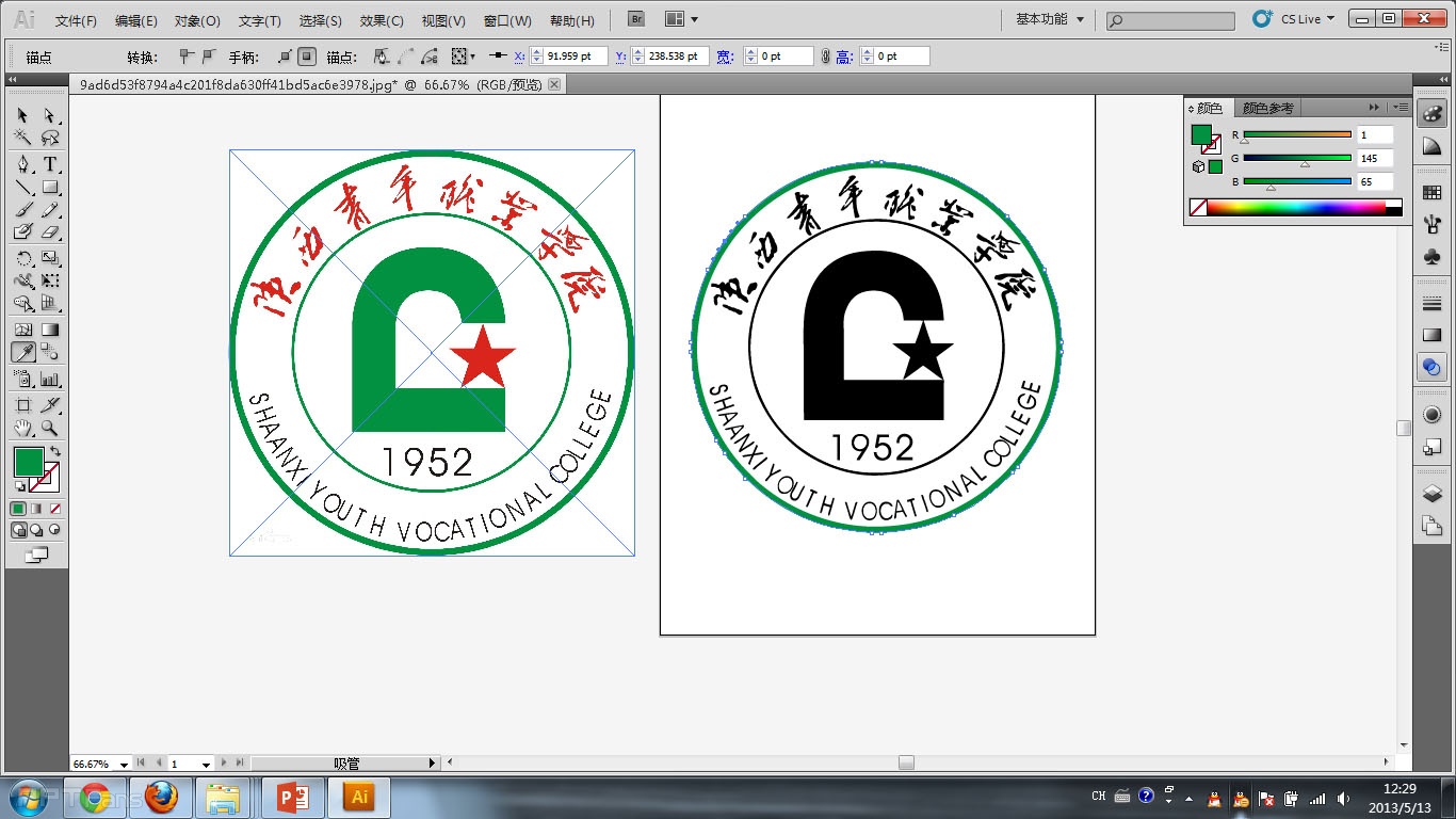 04.把logo图片再拖进来画布中,放到黑白logo旁(方便上色参考用),用“直接选择工具”(工具栏第一排第二个)点击矢量图片需要上色的地方,用“吸管工具”,点击对应的颜色处,即可完成对矢量logo的填色。(提示:此标志有部分元素产生粘连,例如中间星星和旁边元素之间被链接起来了,上色的时候不好分开,需要剪开,这里就不多阐述,篇幅有限,想深入的童鞋再去研究。)