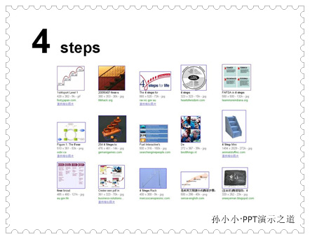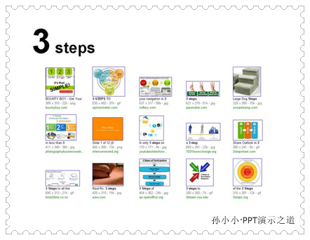到Google图片里,搜索3 steps得到如下结果,你会看到关于3步骤有很多种表达方式。
