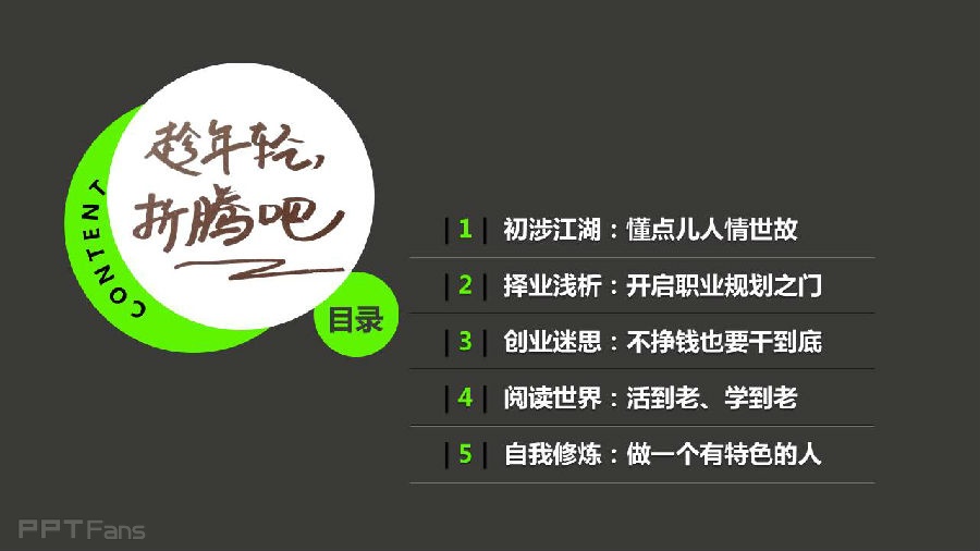 《趁年轻,折腾吧》是零点咨询创始人袁岳写给大学生一本书,我的大学生朋友刘健亮很喜欢这本书,结合这本书他做了一个阅读分享PPT,剧透一下,每一页的微点评是我做的。
