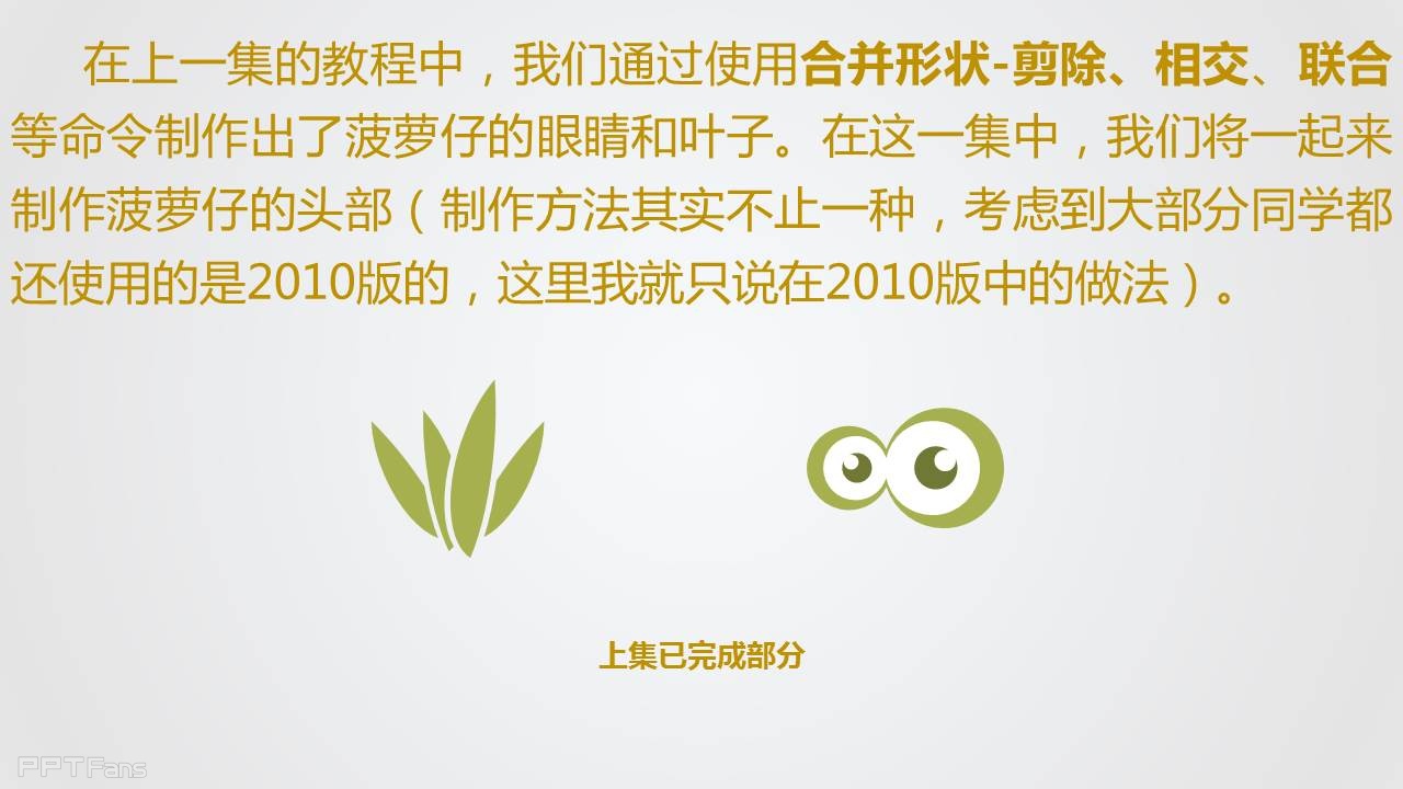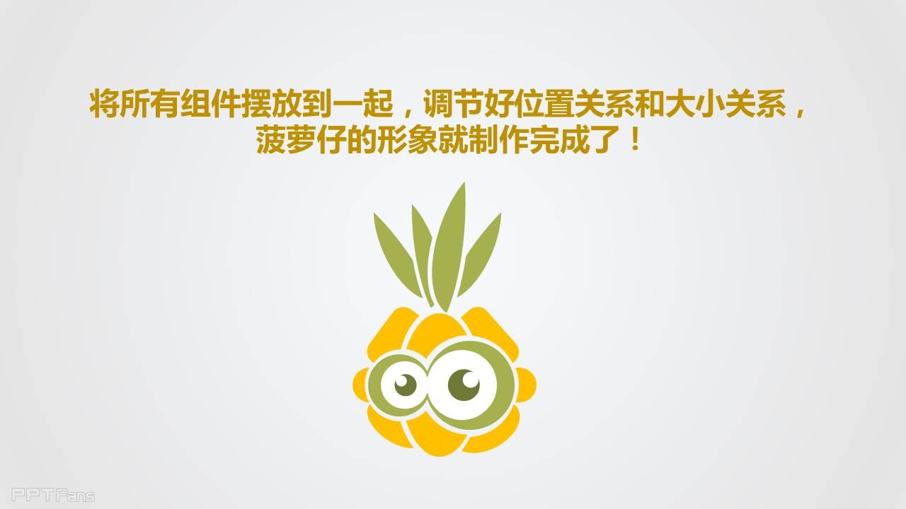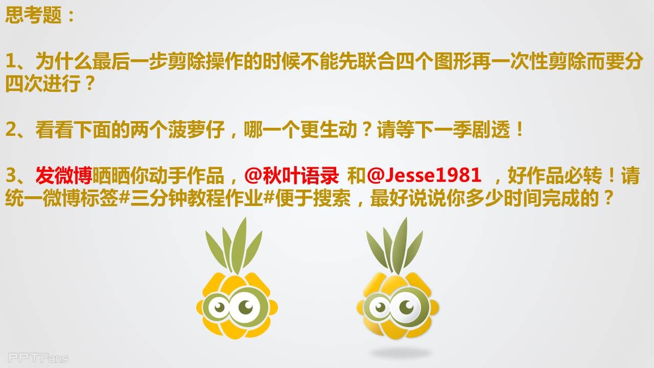 我相信能够完成作业的同学都会获得你身边朋友的惊叹,记得截屏保留你们编辑界面,否则他们还不相信你们会用PPT画菠萝仔,今天试试完成作业后在微信朋友圈拍照分享,我猜这会是你们有史以来评论最多的朋友圈消息,没有之一。