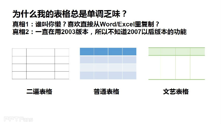 表格是幻灯片设计里面最强大的武器之一,可惜很多人没有意识到这一点,我们说图表化,图表化,其实往往都是图形化。