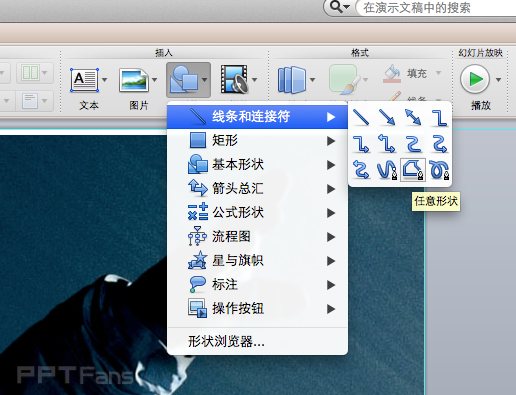1、创建人物剪影。从豆瓣找一张电影海报,贴到PPT里之后,用【任意形状】工具逐点描出轮廓,体力活啊……