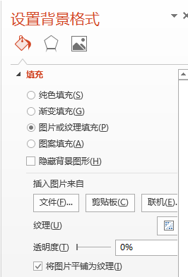 背景的颜色素材包中已经准备好了,我们进入菜单【设计】—【设置背景格式】,填充方式【图片或纹理填充】,点选图片来自【文件】,选择我们素材包中的sky1.png图片,记得勾选【将图片平铺为纹理】,天空的背景颜色就搞定了!