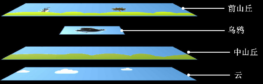 最后还有一个小细节需要注意。就是各图层的关系。因为我们要靠视差效果体现出远近的立体感来,所以各图层的相互遮挡的细节非常重要。云是最远的,所以应该是在最下层,中层是中间的山脉,乌鸦在中层山脉和最前层的磨坊树林之间。这样乌鸦飞过时,就能体现出挡住云,同时又会被树木遮住的立体效果来。