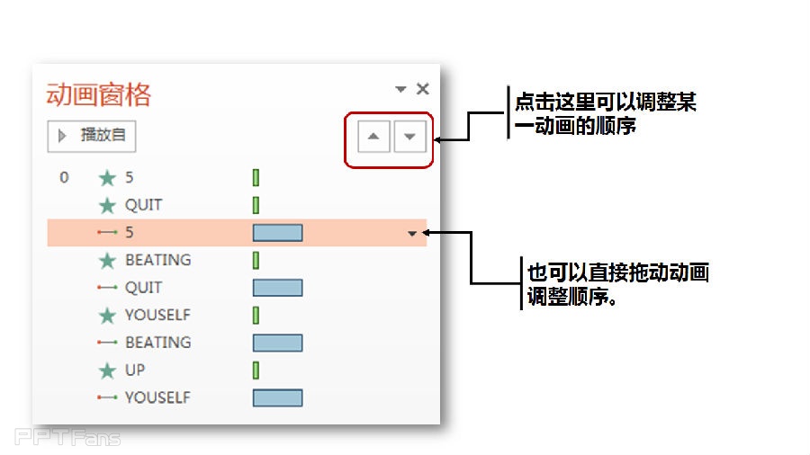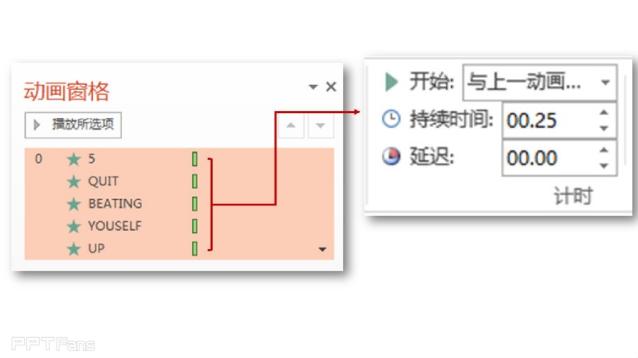 1、首先为页面的上的5个素材:“5”、“quit”、”beating“、”youself"、“up”分别添加从右边飞入的动画效果,计时设定为“上一动画同时",持续时间设定为0.25秒。
