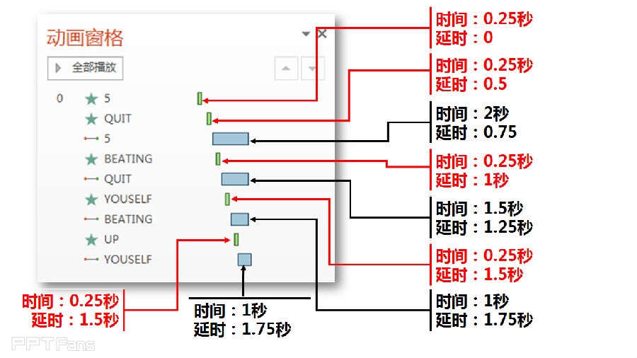 为了防止眼花,红色表示是飞入的动画效果的计时设定,黑色表示撞击后移动的动画小锁计时设定。在飞入的记时设定中,每个素材飞入后,间隔0.5秒,下一个元素飞入。而撞击移动效果则紧随在飞入动画之后。