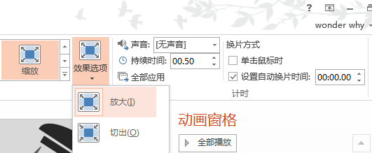 1、设置两个动画场景的切换效果。这里我用的是【切换】菜单下的【缩放】,效果选择【放大】,持续时间0.5秒,别忘记把鼠标单击切换改为自动。