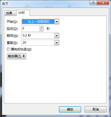 点击【效果选项】右下角的小箭头,打开详细设置界面,选择【计时】选项卡,将【重复】设置为20次。也就是说,水滴下移的动画,将反复自动重复20次,从而实现模拟喷水的效果。当然,这里素材“水”的一部分延伸到页面以外,也是为了保证不出破绽。