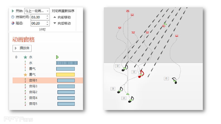 4、添加几个音符的动画。依次为5个音符添加自定义上升的路径,依照原视频的路径大致画一下弯曲的上升路径即可。持续时间设定为和雾气结束时间一致,