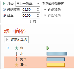 2、选中素材“水”,直接添加【出现动画】,然后再添加【路径】动画,让“水”向斜下方移动一小段距离,大约一个水滴的长度。时间设定为0.2秒,与上一动画同时。