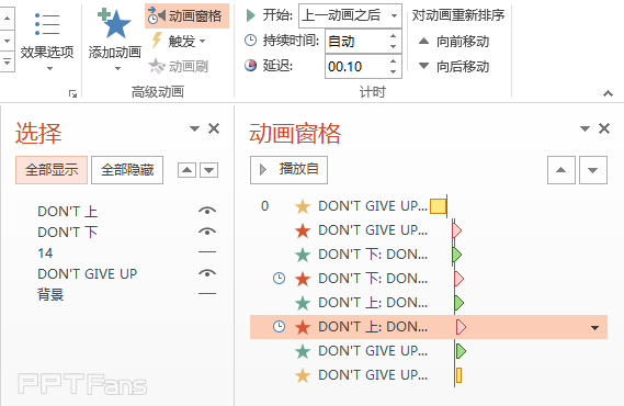 帧图片有了,下面就简单了,复习一下帧动画是怎么做的吧。下一帧进入时上一帧同时退出,时间一般设定为0.1秒。今天只有三帧的动画,相信尝试过我们动画场景10的童鞋们已经瞬间秒杀了。最后在为"don't give up"添加一个【跷跷板】的效果,模拟弹跳结束后颤动的效果,时间也是0.1秒。如果不太清楚进入退出时间线关系的童鞋可以打开我发布的动画源文件,在选择窗口中关闭不需要的素材,详细查看。