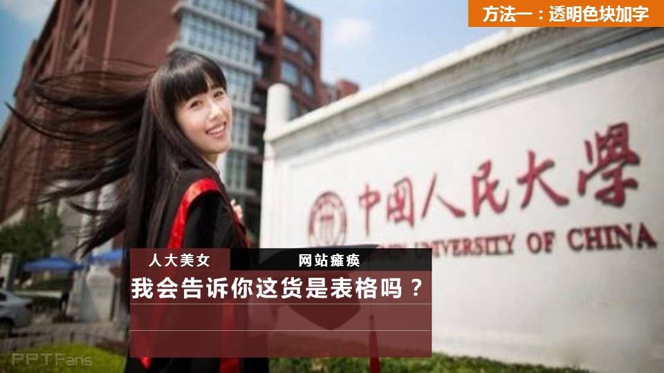 方法1:透明色块,在大图恰当位置,可以模仿网页放置透明色块,然后填上文字,好处是大图的整体感不被破坏。