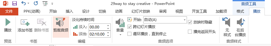 ? ? 让我们先回到我们PPT的第一页“29 way to stay creative”,点击主菜单的【插入】-【音频】-【PC上的音频】,在电脑中选中音乐文件。