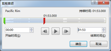 打开【音频工具】菜单,刚刚显示的幻灯片播放时间是1分53秒,所以点击【裁剪音频】,将结束的红色光标拖动到1分53秒处,或者直接在后面的时间框中输入1:53。