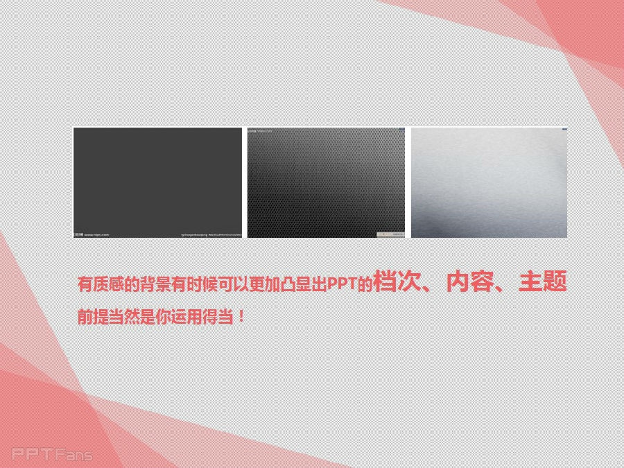 白白的PPT背景,总让人觉得差点什么,我们常常会插入背景图片,添加背景颜色来削弱这种单调感,有没有考虑过用纹理作为背景呢?有质感的背景有时候可以更加凸显出PPT的档次、内容、主题,当然,前提当然是你运用得当!
