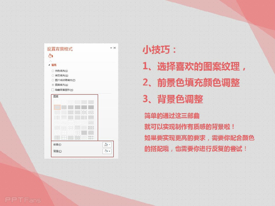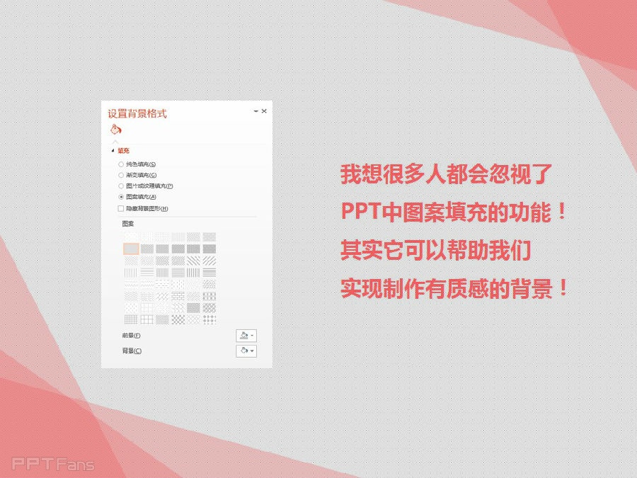 有质感的背景上哪找去?不用上百度、Google,PPT就能帮你实现!我想很多人都会忽视了PPT中图案填充的功能!其实它可以帮助我们实现制作有质感的背景!