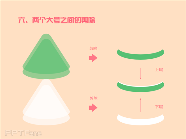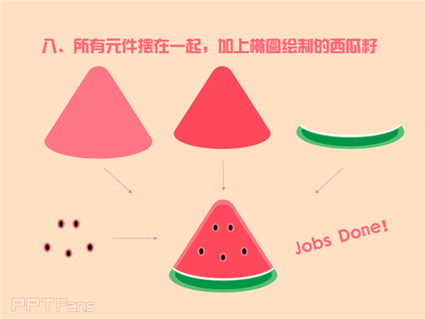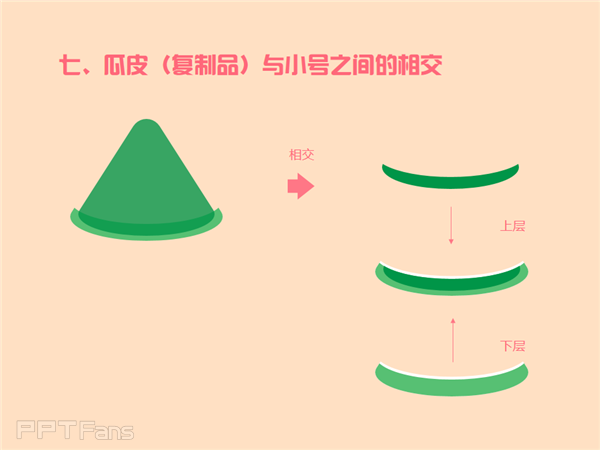 第六步注意白色形状重叠比绿色形状重叠得稍微稀疏一点,这样剪除后剩下的“瓜皮”,白色才会比绿色厚,重叠之后才能露出白边来。