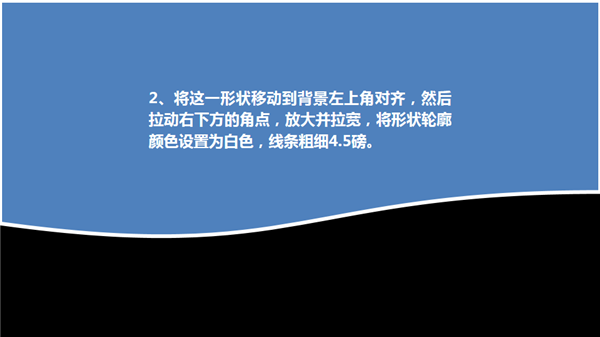 第二步:将这一形状移动到背景左上角对齐,然后拉动右下方的角点,放大并拉宽,将形状轮廓颜色设置为白色,线条粗细4.5磅。