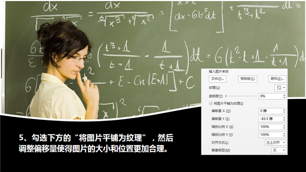 第五步; 勾选下方的“将图片平铺为纹理”,然后调整偏移量使得图片的大小和位置更加合理。