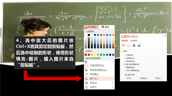第四步:选中放大后的图片按Ctrl+X将其剪切到剪贴板,然后选中绘制的形状,使用形状填充-图片,插入图片来自“剪贴板”。