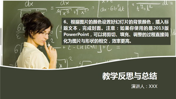 第六步:根据图片的颜色设置好幻灯片的背景颜色,插入标题文本,完成封面。注意:如果你使用的是2013版PowerPoint,可以将剪切、填充、调整的过程直接简化为图片与形状的相交,效率更高。