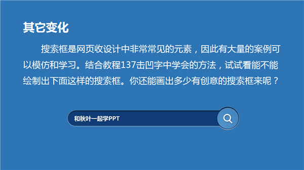搜索框是网页中非常常见的元素,有时将它使用到PPT当中也能为你的作品增彩不少,而模拟在搜索框中输入并且点击搜索的动画方式相信你也在电视广告中国见过不少了吧?今天的三分钟作业完成之后一定要存好,说不定下次就能用到你的某一个综合作品中去哦!