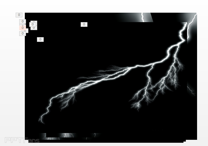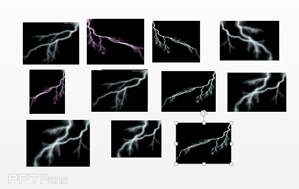 把刚才找到的黑色底色的10来张张闪电的图片放到PPT中。随意拖放,改变图片的大小。素材不够的话,可以把图片水平翻转后多次利用。