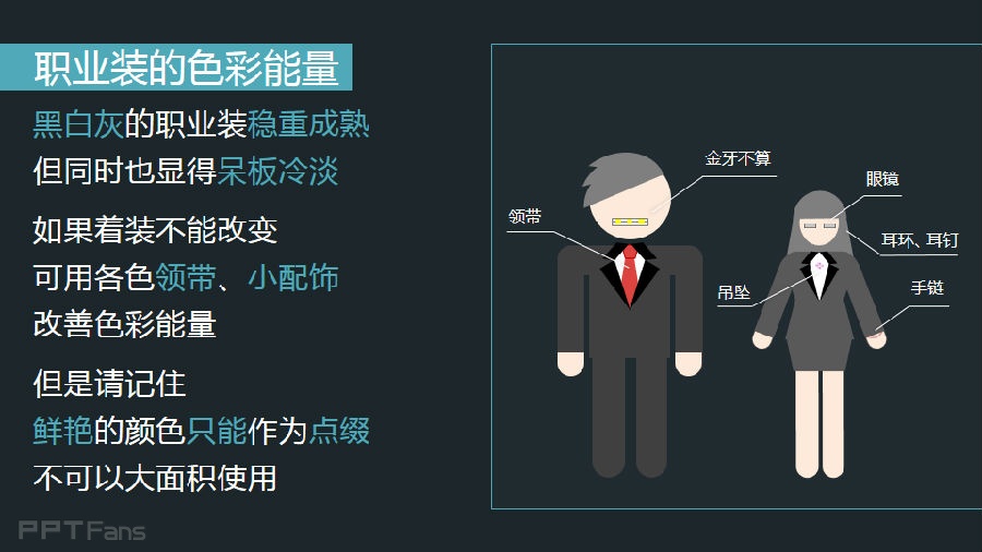黑白灰的职业装庄重成熟,但同时也显得呆板冷淡,如果着装不能改变,可用各色领带,小饰件改善色彩能量,但是请记住,鲜艳的颜色只能作为点缀,不可以大面积使用。
