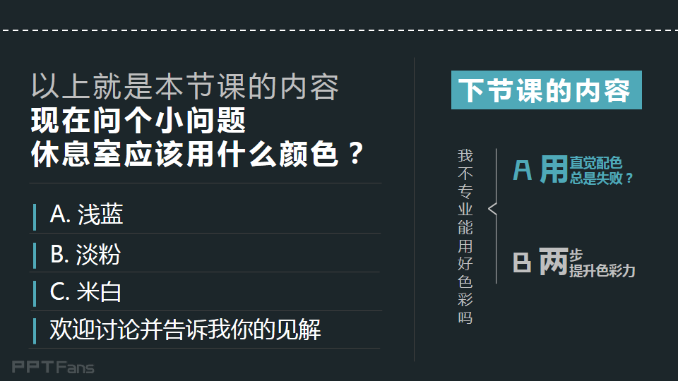 以上就是本节课的内容,现在问个小问题,休息室应该用什么颜色?