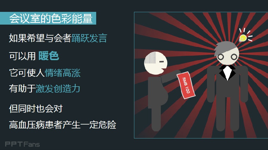 如果希望与会者踊跃发言,可以用暖色,它可以使人情绪高涨,有助于技法创造力,但同时也会对高血压病患者产生一定危险。