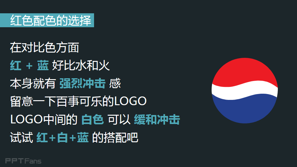 在对比色方面,红+蓝好比水和火,本身就有强烈冲击感,留意一下百事可乐的LOGO,LOGO中间的 白色可以缓和冲击,试试红+白+蓝的搭配吧。