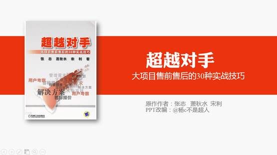 今天的分享是我的读书笔记《大项目售前售后的30个实战技巧》的部分修改,以及做读书笔记PPT的小小心得。大项目这本书的实用性非常强,逻辑条理,架构清晰,适合当工具书看。如果不加思考地从头到尾读一遍,要真正吸收书中的知识很难,而制作读书笔记的一个好处就是,能迫使你带着目的去读书,可以读得更快,更深刻。在制作PPT的时候,我根据自己的兴趣点将其中的具体技能提炼成为四个通用的技能:演说、调研、文案、团队,并以此作为PPT的主线,这样即使不是做大项目销售的读者,也能有所收获。