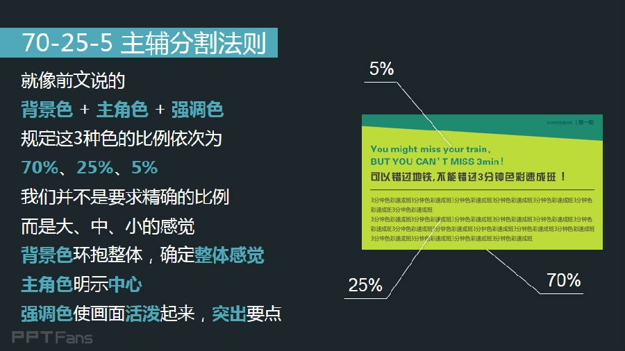 就像前文说的,背景色+主角色+强调色,规定这3种色的比例依次为70%、25%、5%,我们并不是要求精确的比例,而是大、中、小的感觉,背景色环抱整体,确定整体感觉,主角色明示中心,强调色使画面活泼起来,突出要点。