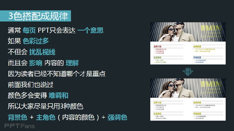 通常每页PPT只会表达一个意思,如果色彩过多,不但会扰乱视线,而且会影响内容的理解,因为读者已经不知道哪个才是重点,前面我们也说过,颜色多会变得难调和,所以大家尽量只用3种颜色,背景色+主角色(内容的颜色)+强调色。