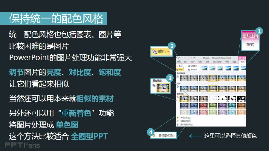 统一配色风格也包括图表、图片等,比较困难的是图片,PowerPoint的图片处理功能非常强大,调节图片的亮度、对比度、饱和度,让他们看起来相似,当然还可以用本来就相似的素材,另外还可以用“重新着色”功能,将图片处理成单色图,这个方法比较适合全图型PPT.