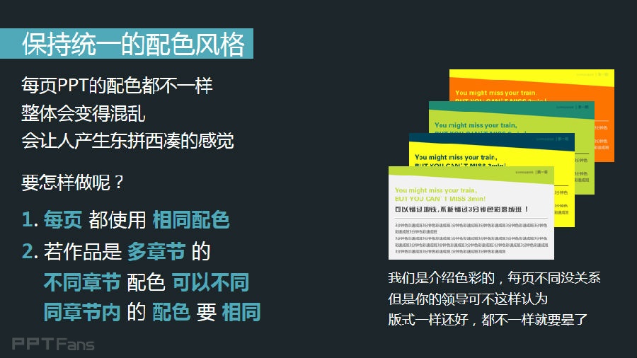 每页PPT的配色都不一样,整体会变得混乱,会让人产生东拼西凑的感觉,要怎样做呢?