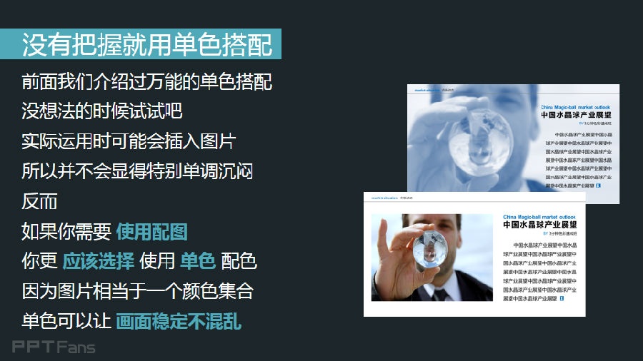 前面我们介绍过万能的单色搭配,没想法的时候试试吧,实际运用时可能会插入图片,所以并不会显得特别单调沉闷。反而,如果你需要使用配图,你更应该选择使用单色配色,因为图片相当于一个颜色集合,单色可以让画面稳定不混乱。